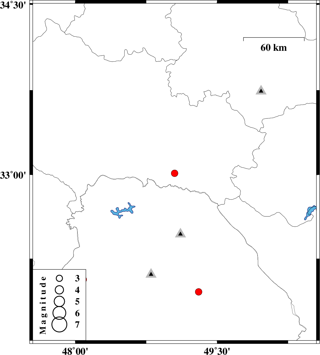 | 2024/01/27 | 21:58:09.7 | 01:28:09.7 | 33.013 | 49.05 | 12 | ML3.3 | Lorestan Province, 52 km South of Dorud | ||