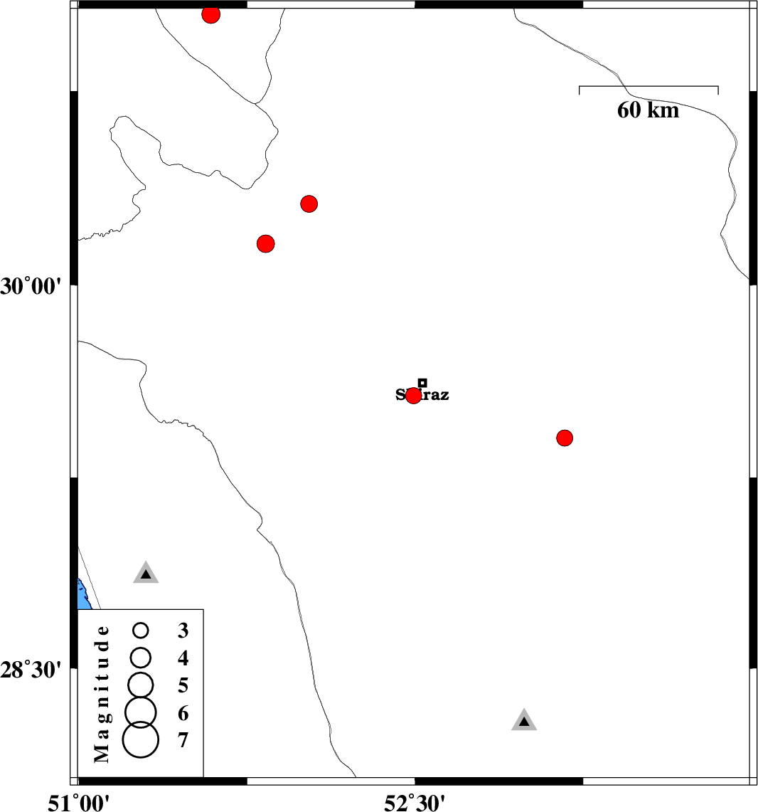 | 2024/01/31 | 03:29:54.8 | 06:59:54.8 | 29.569 | 52.493 | 8 | ML3.3 | Fars Province, 7 km of Shiraz | ||
