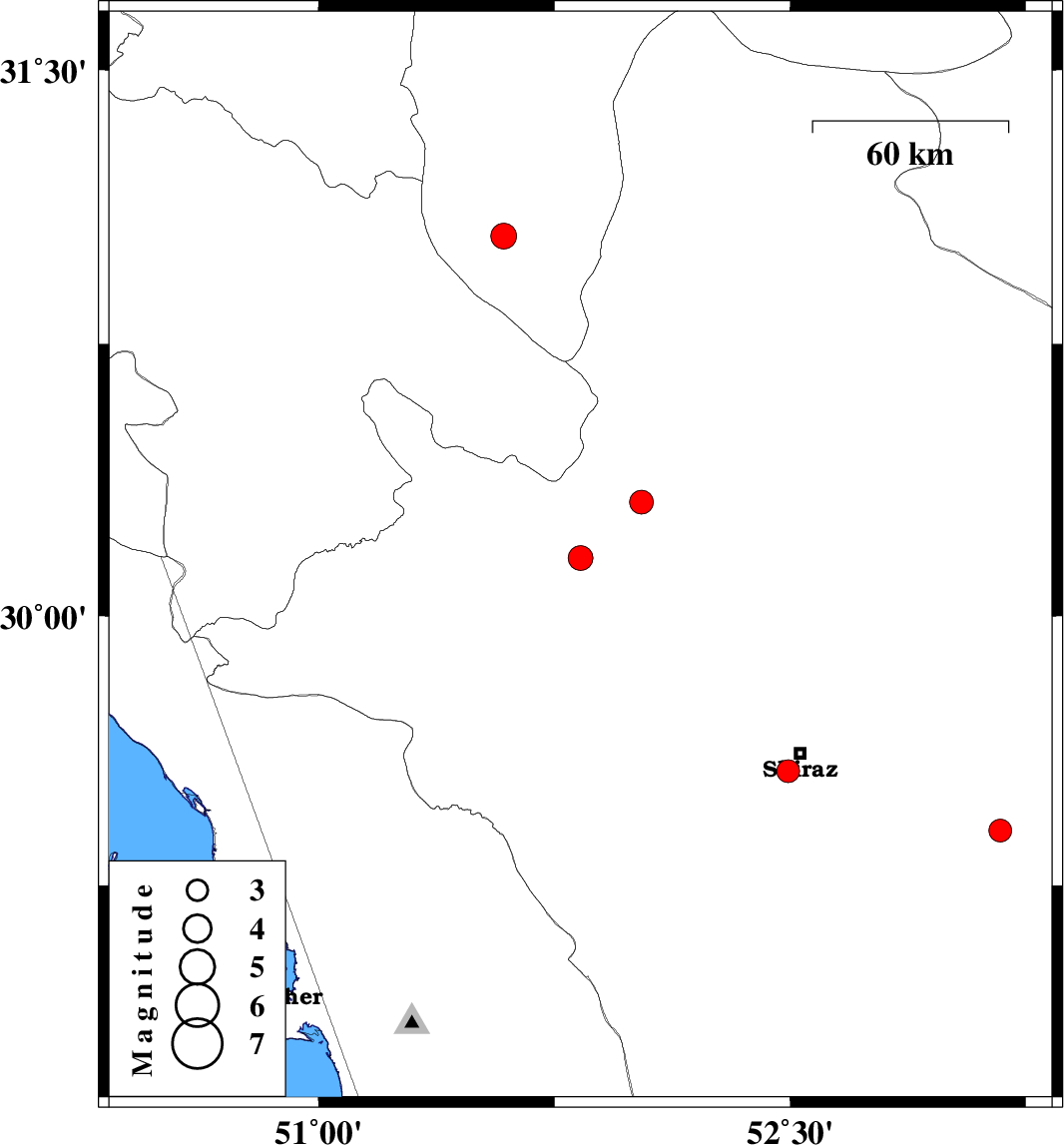 | 2024/01/31 | 03:29:54.8 | 06:59:54.8 | 29.569 | 52.493 | 8 | ML3.3 | Fars Province, 7 km of Shiraz | ||
