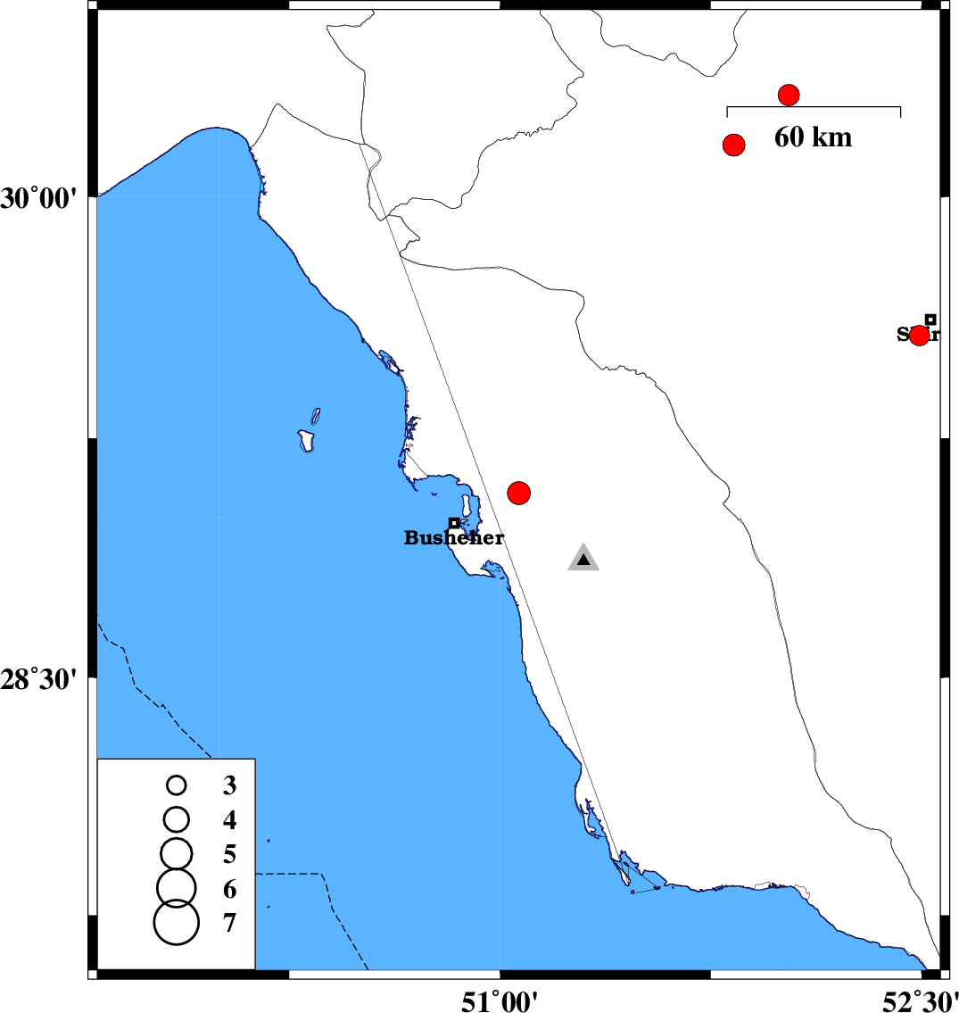 | 2024/02/07 | 01:25:31.8 | 04:55:31.8 | 29.078 | 51.067 | 16 | ML3.6 | Bushehr Province, 25 km South-West of Borazjan | ||