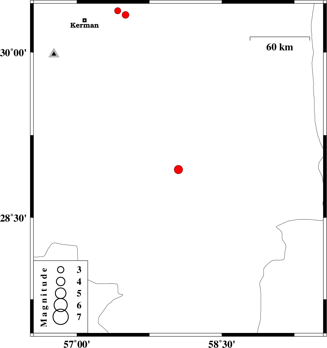 | 2024/02/09 | 14:56:33.2 | 18:26:33.2 | 30.336 | 57.502 | 7 | ML3.2 | Kerman Province, 41 km -East of Kerman |
