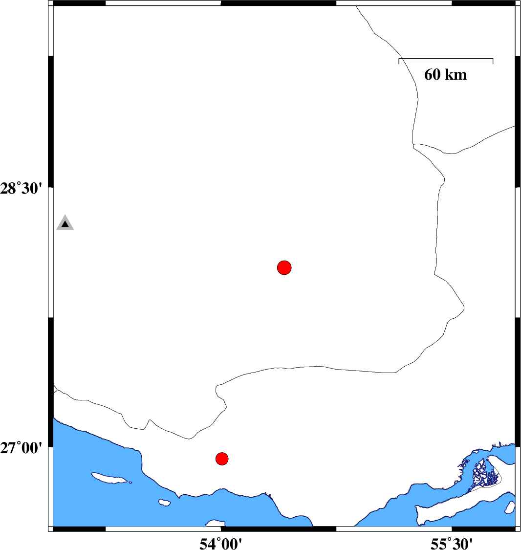 | 2024/04/03 | 06:56:22.1 | 10:26:22.1 | 26.931 | 54.006 | 12 | ML3.6 | Hormozgan Province, 46 km South-West of Bastak |