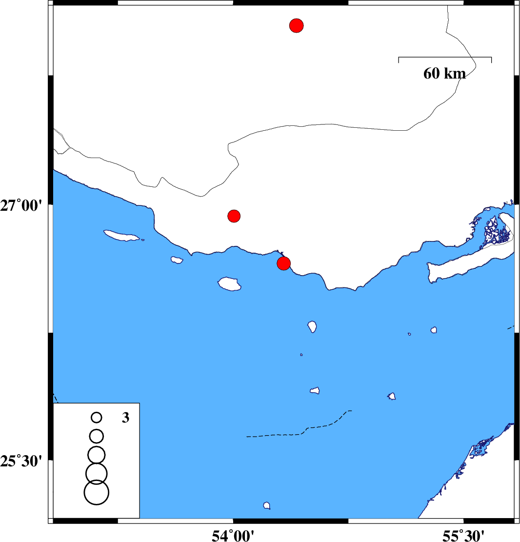 | 2024/04/06 | 04:54:51.5 | 08:24:51.5 | 26.655 | 54.329 | 12 | ML3.9 | Persian Gulf, 60 km South of Bastak | ||