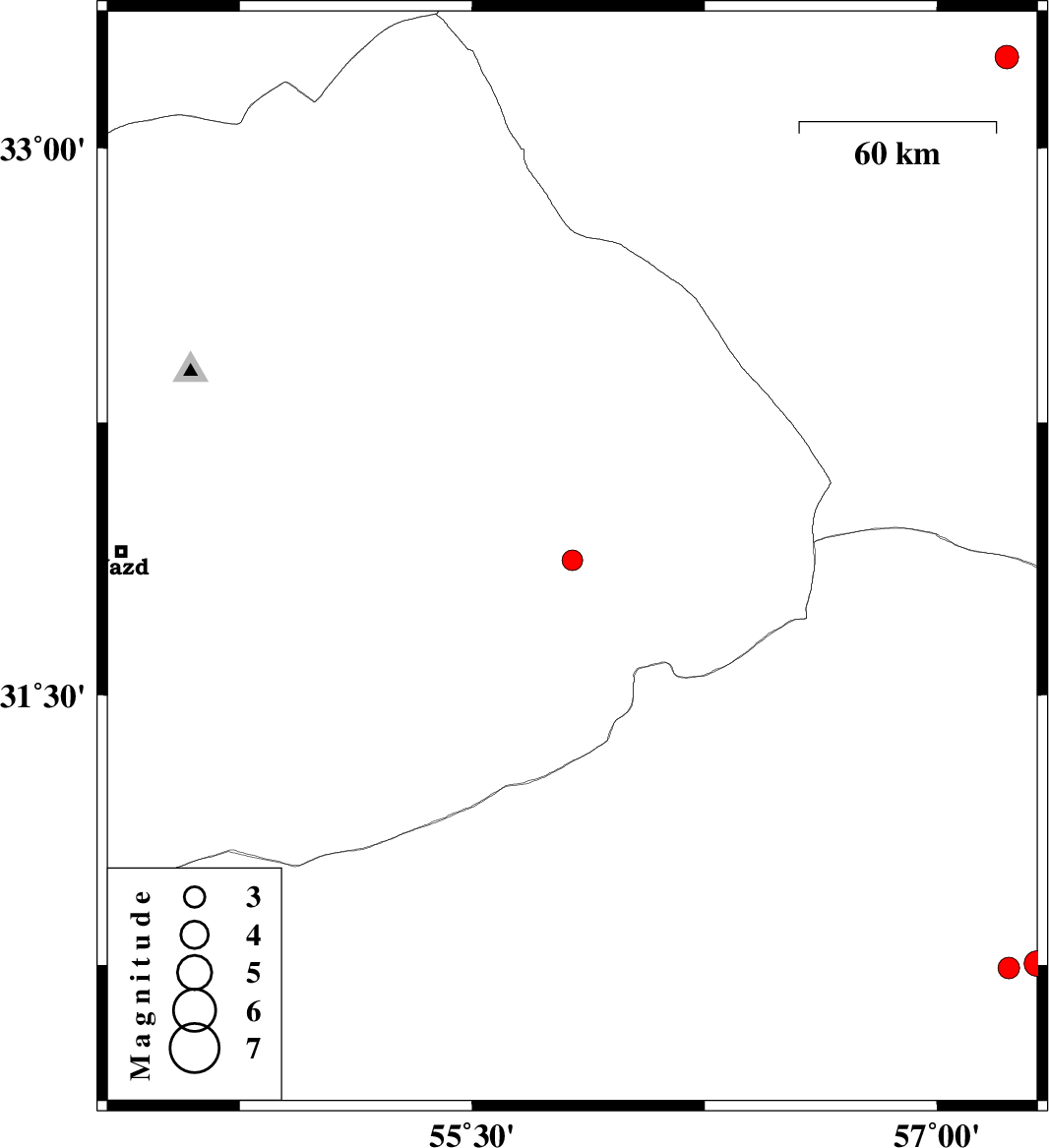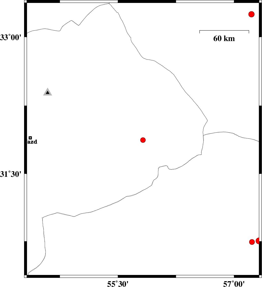 | 2024/04/01 | 13:44:03.6 | 17:14:03.6 | 33.247 | 57.225 | 7 | ML3.4 | Yazd Province, 48 km South-East of Tabas | ||