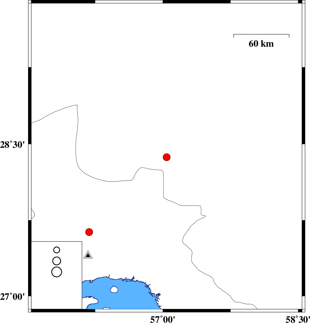 | 2024/04/27 | 22:52:13.2 | 02:22:13.2 | 28.37 | 57.042 | 10 | ML3.6 | Kerman Province, 76 km South-West of Jiroft | ||