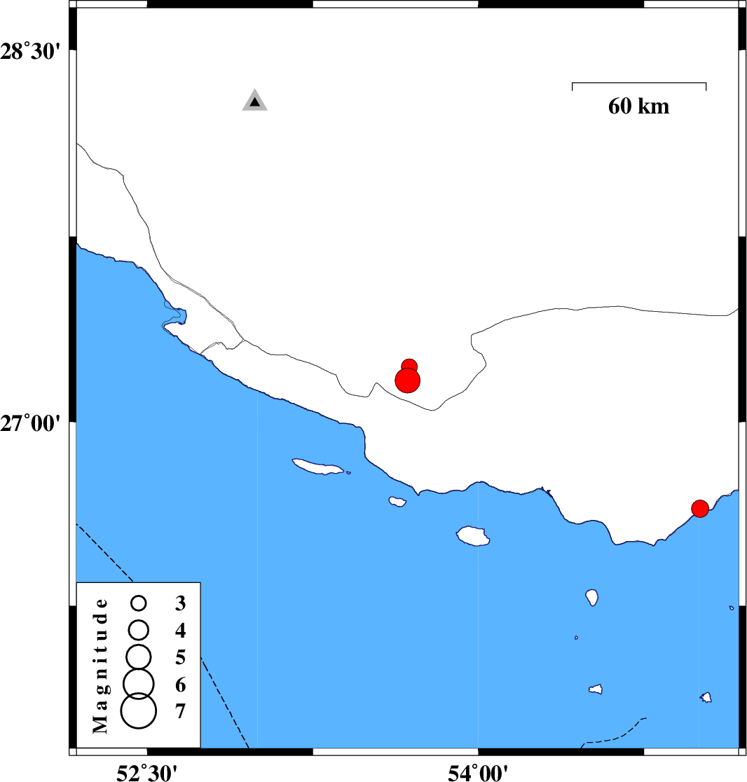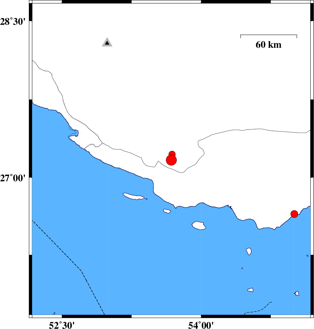 | 2024/05/23 | 17:07:31.1 | 20:37:31.1 | 27.168 | 53.679 | 16 | ML5.1 | Fars Province, 54 km South-East of Lamerd | ||