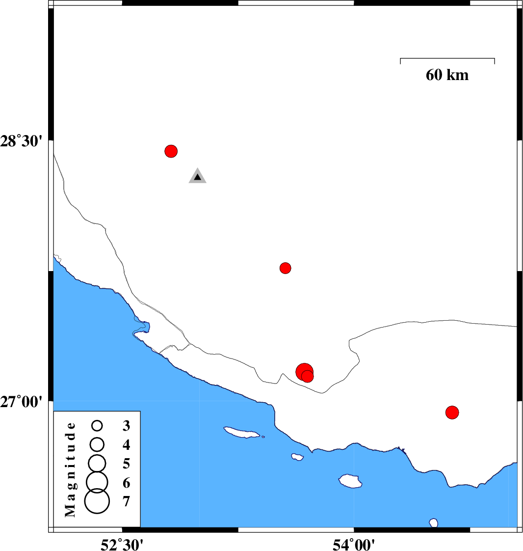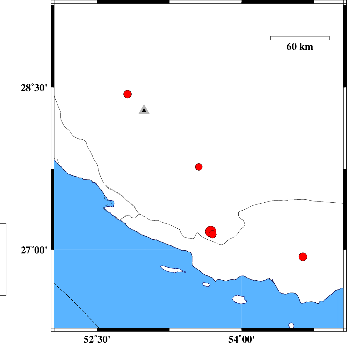 | 2024/05/23 | 17:07:31.1 | 20:37:31.1 | 27.168 | 53.679 | 16 | ML5.1 | Fars Province, 54 km South-East of Lamerd |