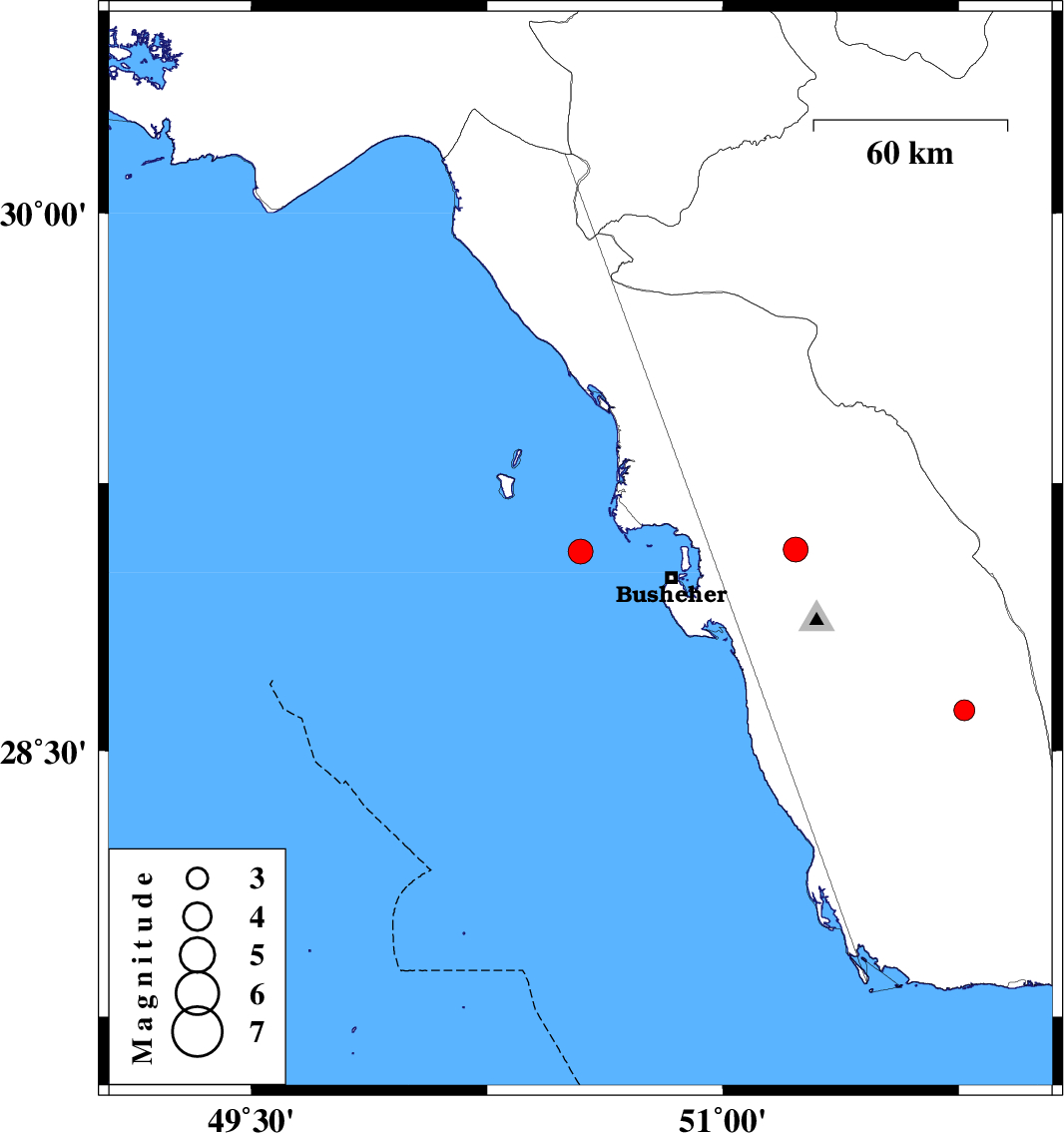 | 2024/06/07 | 02:12:16.2 | 05:42:16.2 | 29.058 | 50.547 | 12 | ML3.5 | Persian Gulf, 29 km -West of Busheher | ||