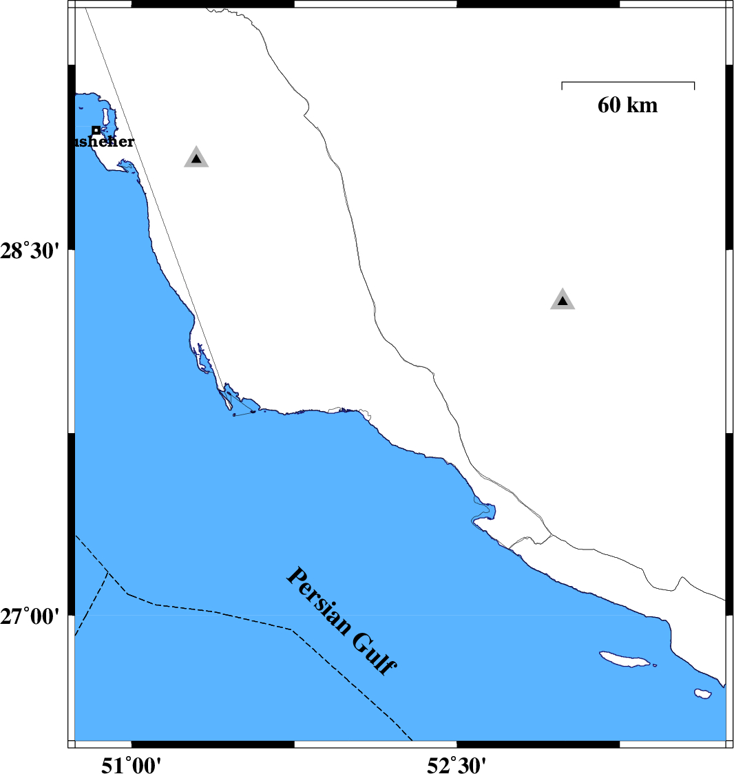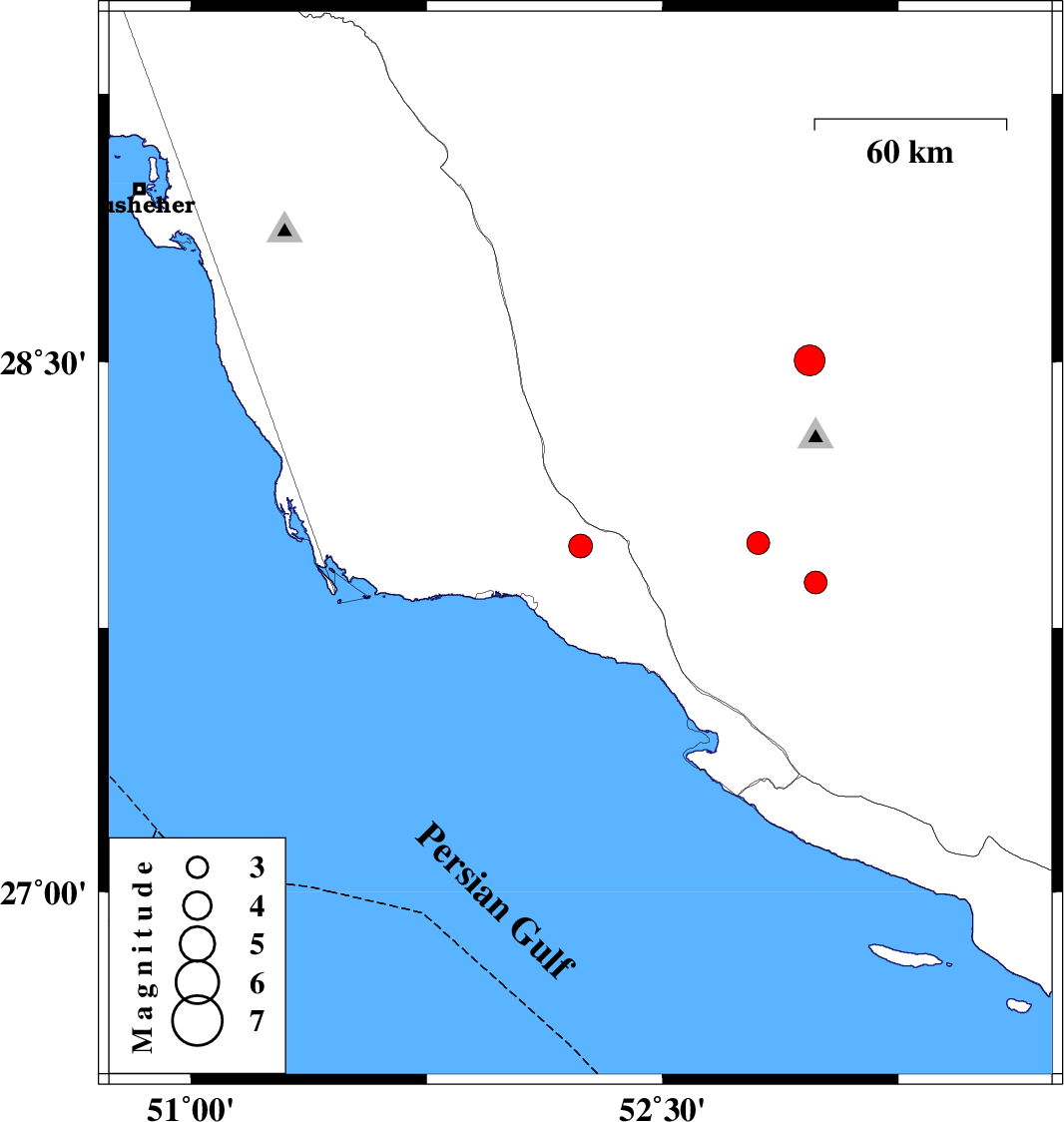 | 2024/06/14 | 13:18:54.1 | 16:48:54.1 | 27.981 | 52.239 | 20 | ML3.4 | Bushehr Province, 18 km North of Jam | ||