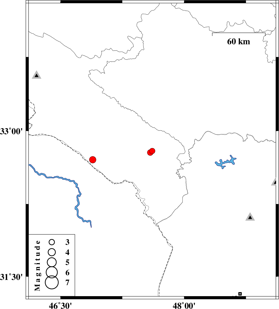 | 2024/06/17 | 05:45:13.7 | 09:15:13.7 | 32.778 | 47.589 | 12 | ML3.3 | Ilam Province, 20 km South-East of Abdanan | ||