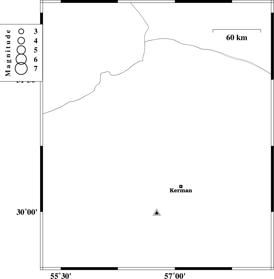 | 2024/06/15 | 06:26:54.9 | 09:56:54.9 | 30.451 | 56.226 | 16 | ML3.5 | Kerman Province, 23 km -East of Rafsanjan | ||