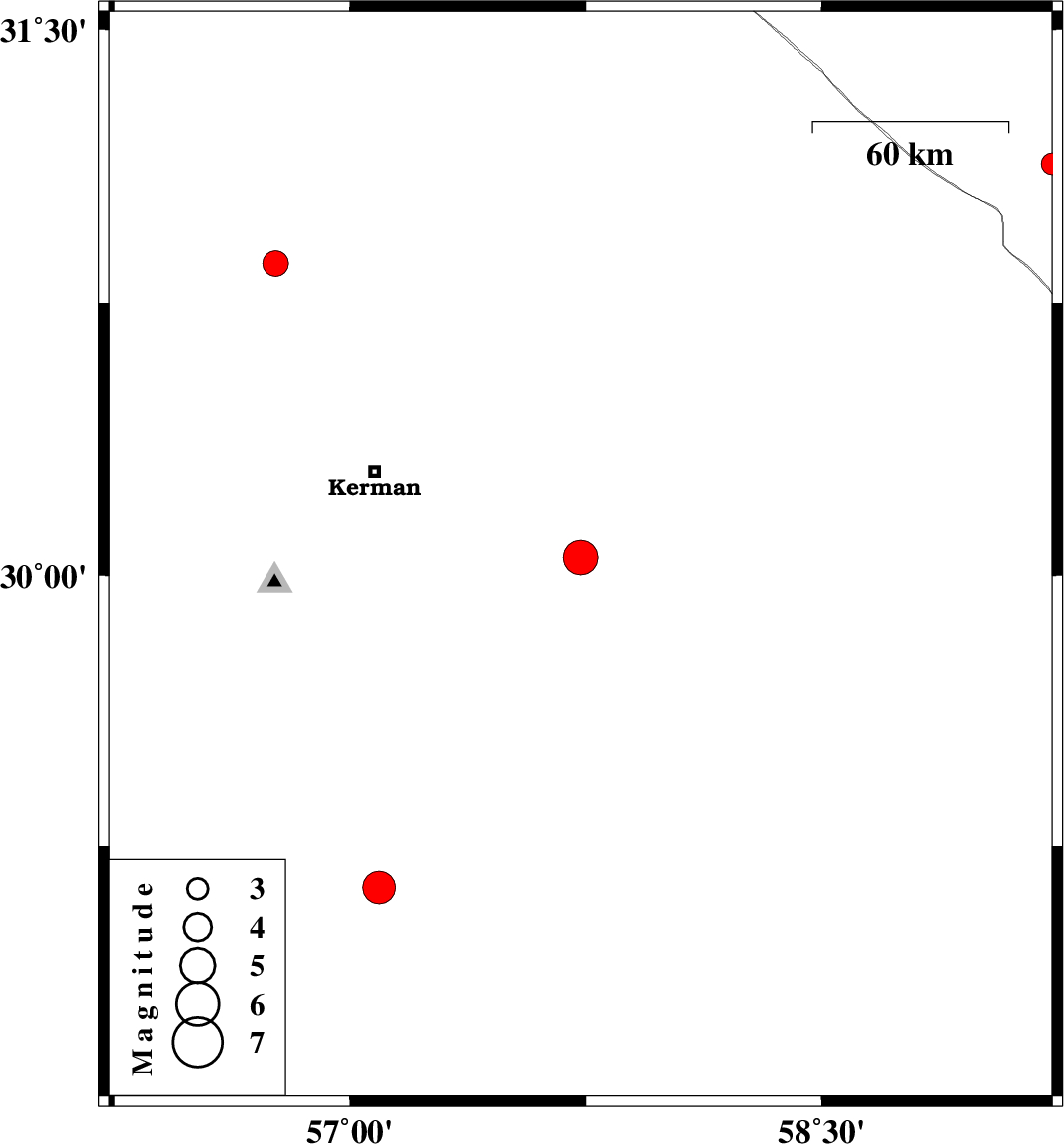 | 2024/07/16 | 01:19:06.5 | 04:49:06.5 | 30.05 | 57.733 | 12 | ML5 | Kerman Province, 68 km South-East of Kerman | ||