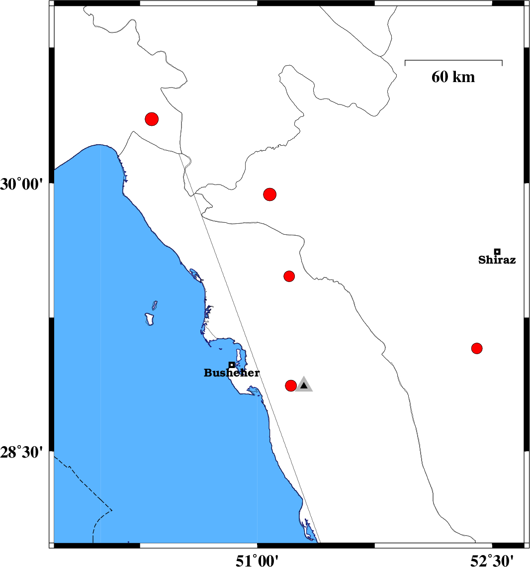| 2024/07/20 | 20:12:29.1 | 23:42:29.1 | 30.355 | 50.326 | 10 | ML3.8 | Khoozestan Province, 28 km South of Behbahan | ||