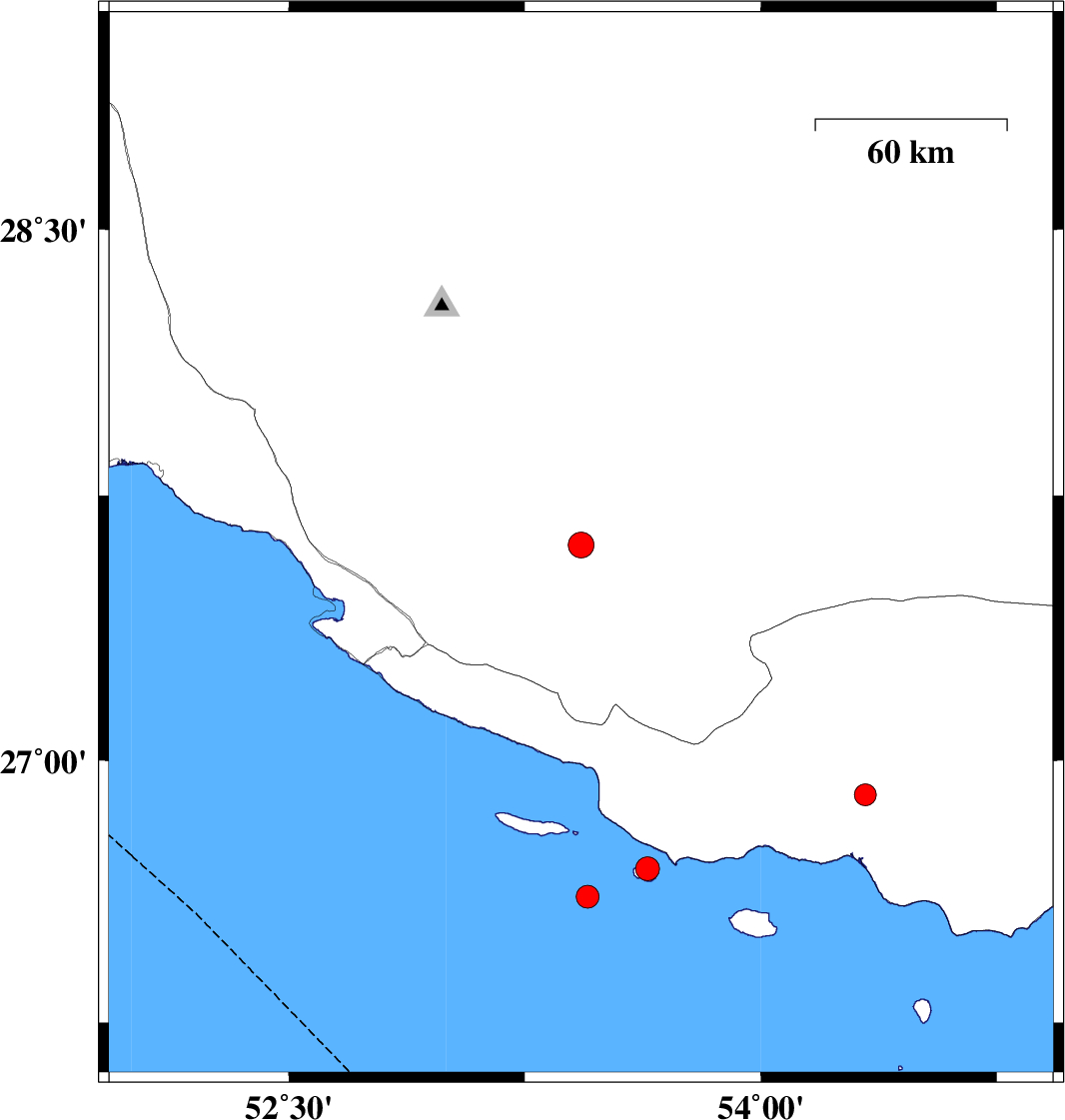 | 2020/07/23 | 20:56:40.8 | 01:26:40.8 | 26.61 | 53.45 | 41 | ML3.2 | Persian Gulf, 85 km South-East of Lamerd | ||