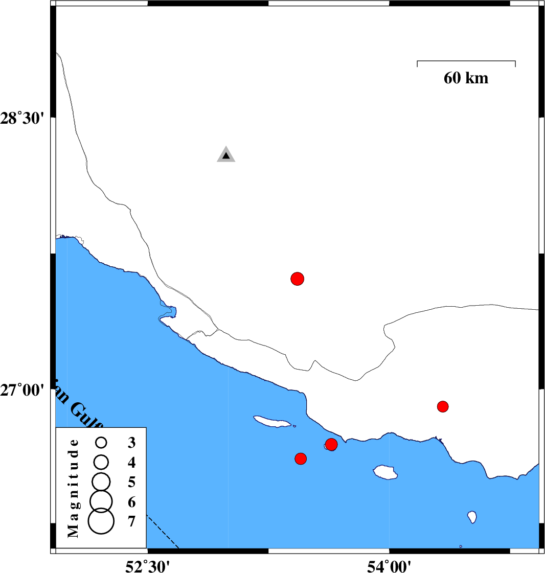 | 2020/07/23 | 23:28:39.3 | 03:58:39.3 | 26.69 | 53.64 | 21 | ML3.4 | Persian Gulf, 85 km South-East of Lamerd | ||