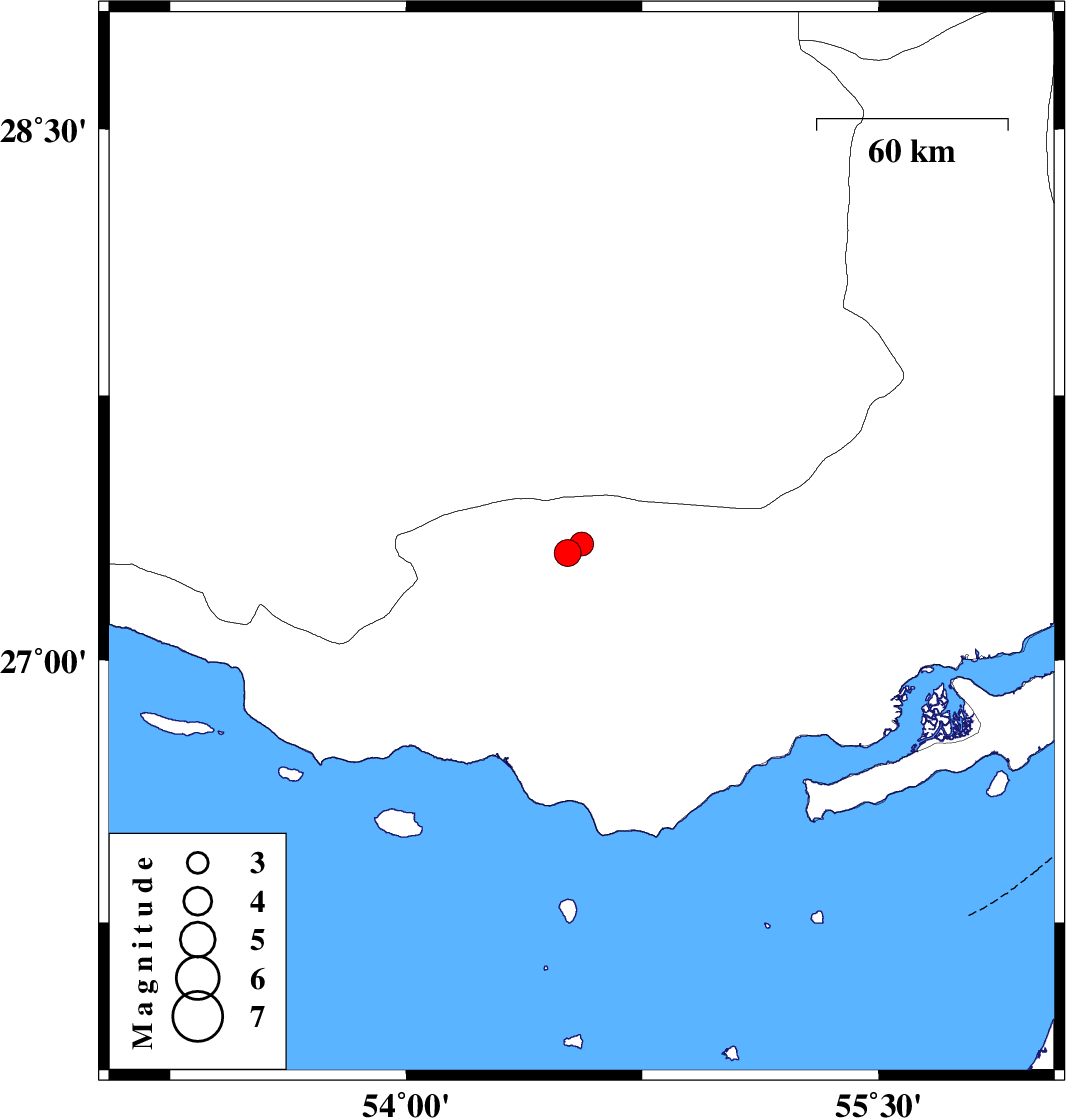 | 2024/10/17 | 21:30:17.1 | 01:00:17.1 | 27.329 | 54.557 | 12 | ML3.4 | Hormozgan Province, 24 km North-East of Bastak |