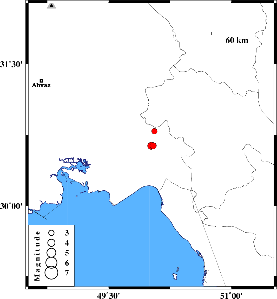 | 2024/11/08 | 07:07:18.8 | 10:37:18.8 | 30.636 | 50.019 | 12 | ML3.9 | Khoozestan Province, 22 km -West of Behbahan | ||