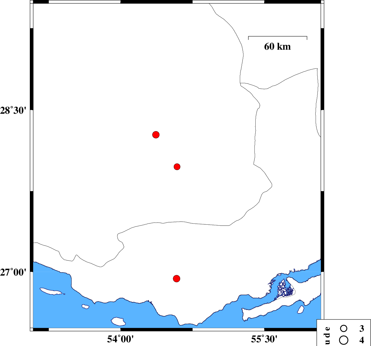 | 2024/11/12 | 05:58:08.3 | 09:28:08.3 | 27.976 | 54.588 | 17 | ML3 | Fars Province, 41 km North-East of Lar | ||