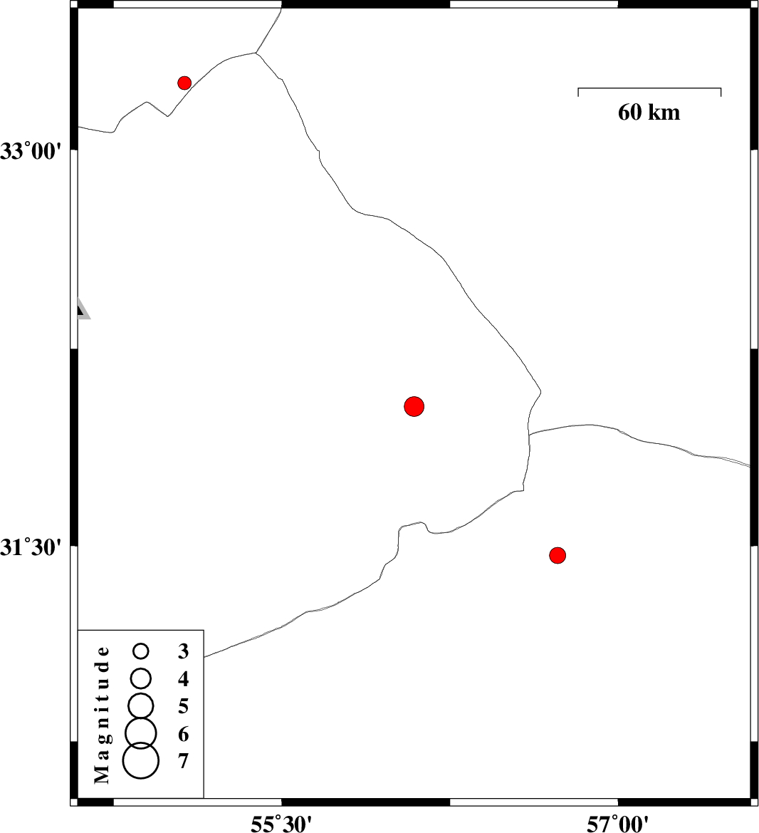 | 2024/11/10 | 22:17:55.9 | 01:47:55.9 | 31.463 | 56.73 | 10 | ML3.2 | Kerman Province, 23 km North of Ravar |