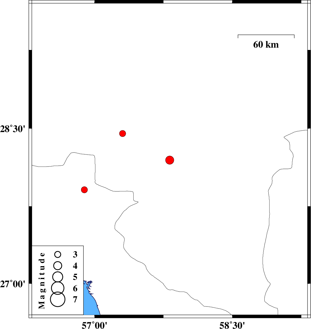| 2024/11/02 | 07:40:52.9 | 11:10:52.9 | 28.451 | 57.305 | 12 | ML3.1 | Kerman Province, 49 km South-West of Jiroft |