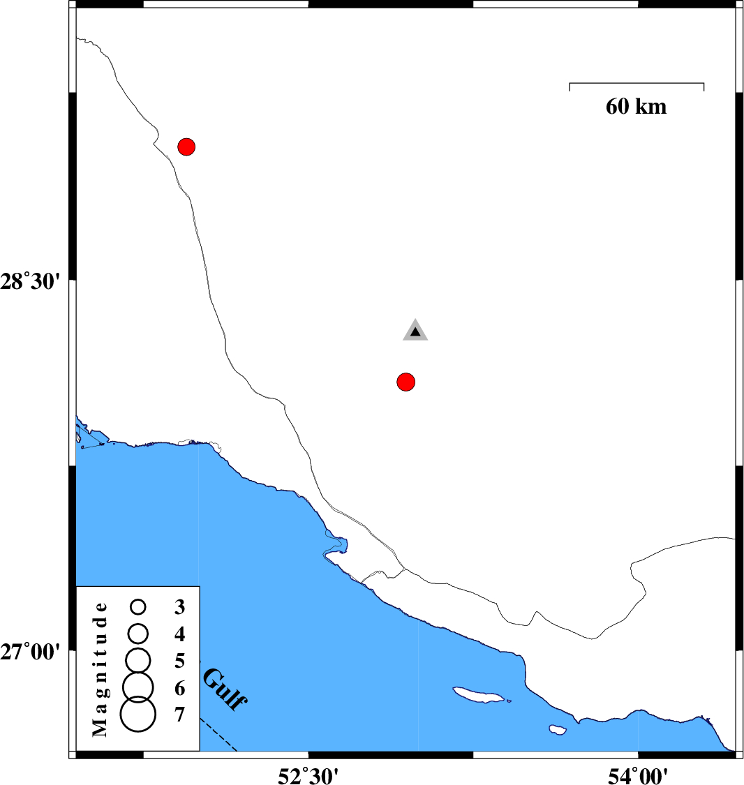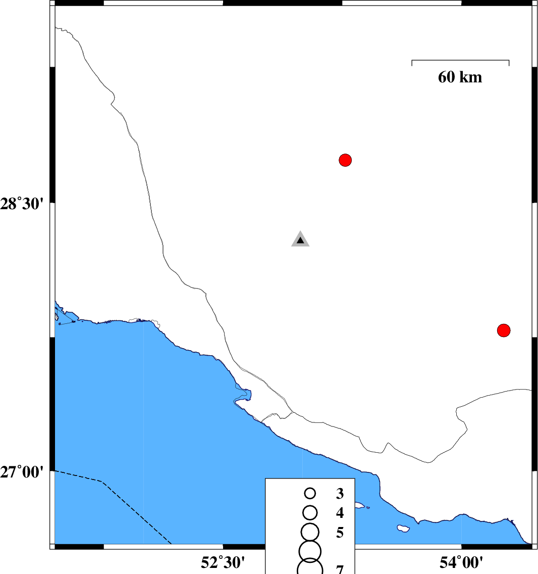 | 2024/11/26 | 19:59:32.1 | 23:29:32.1 | 28.088 | 52.943 | 23 | ML3.6 | Fars Province, 43 km South of Qir va Karzin | ||