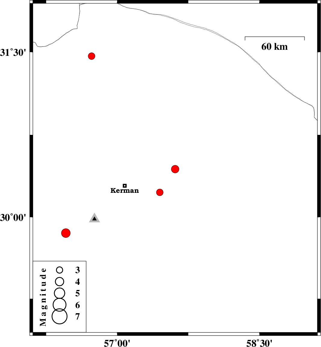 | 2024/11/10 | 22:17:55.9 | 01:47:55.9 | 31.463 | 56.73 | 10 | ML3.2 | Kerman Province, 23 km North of Ravar | ||
