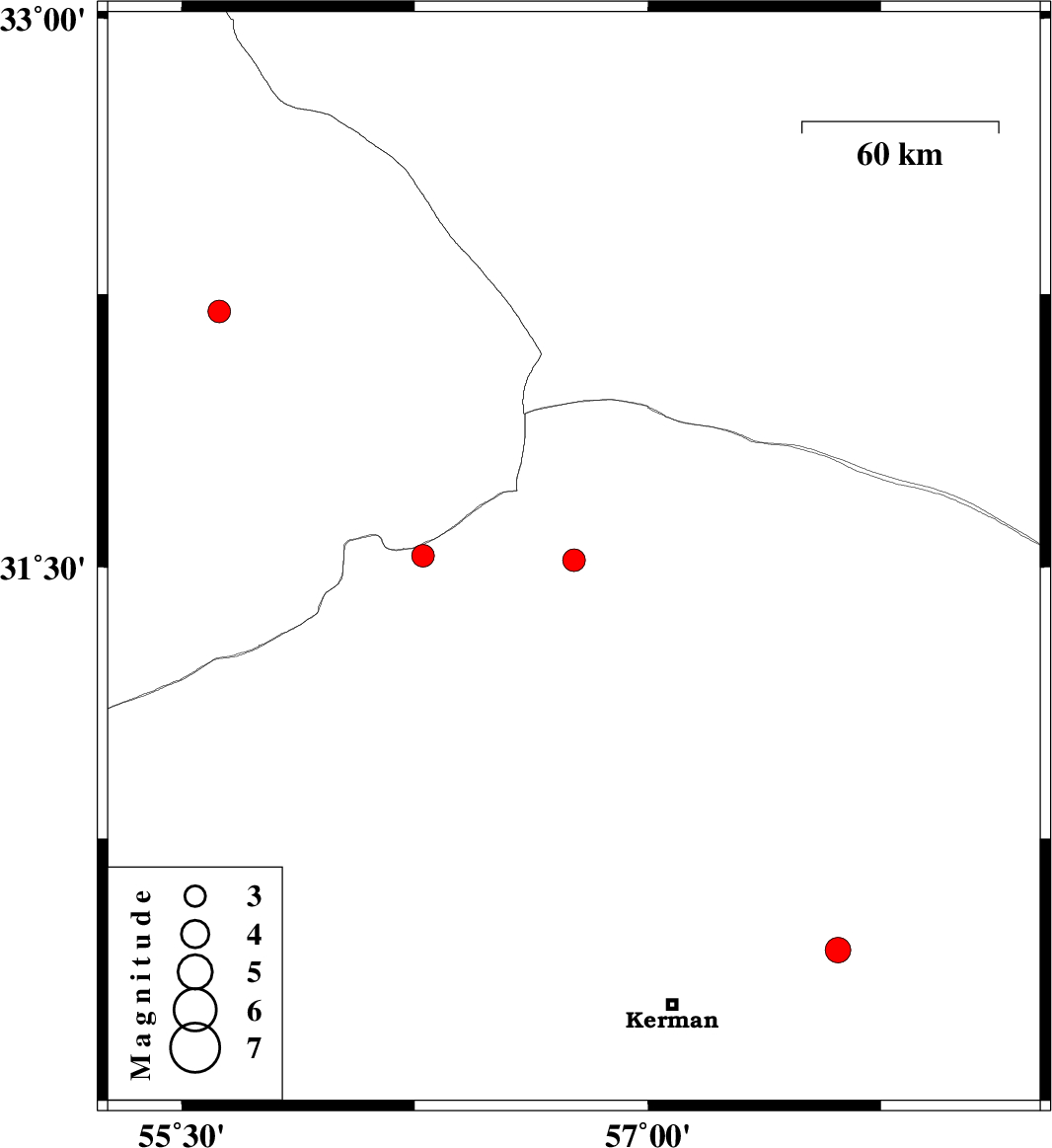 | 2024/11/30 | 19:01:53.8 | 22:31:53.8 | 30.439 | 57.611 | 12 | ML3.7 | Kerman Province, 54 km North-East of Kerman | ||