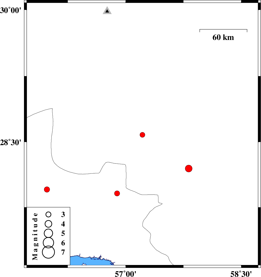 | 2024/11/19 | 12:53:06.4 | 16:23:06.4 | 28.195 | 57.818 | 10 | ML4.1 | Kerman Province, 30 km North-East of Kahnuj | ||