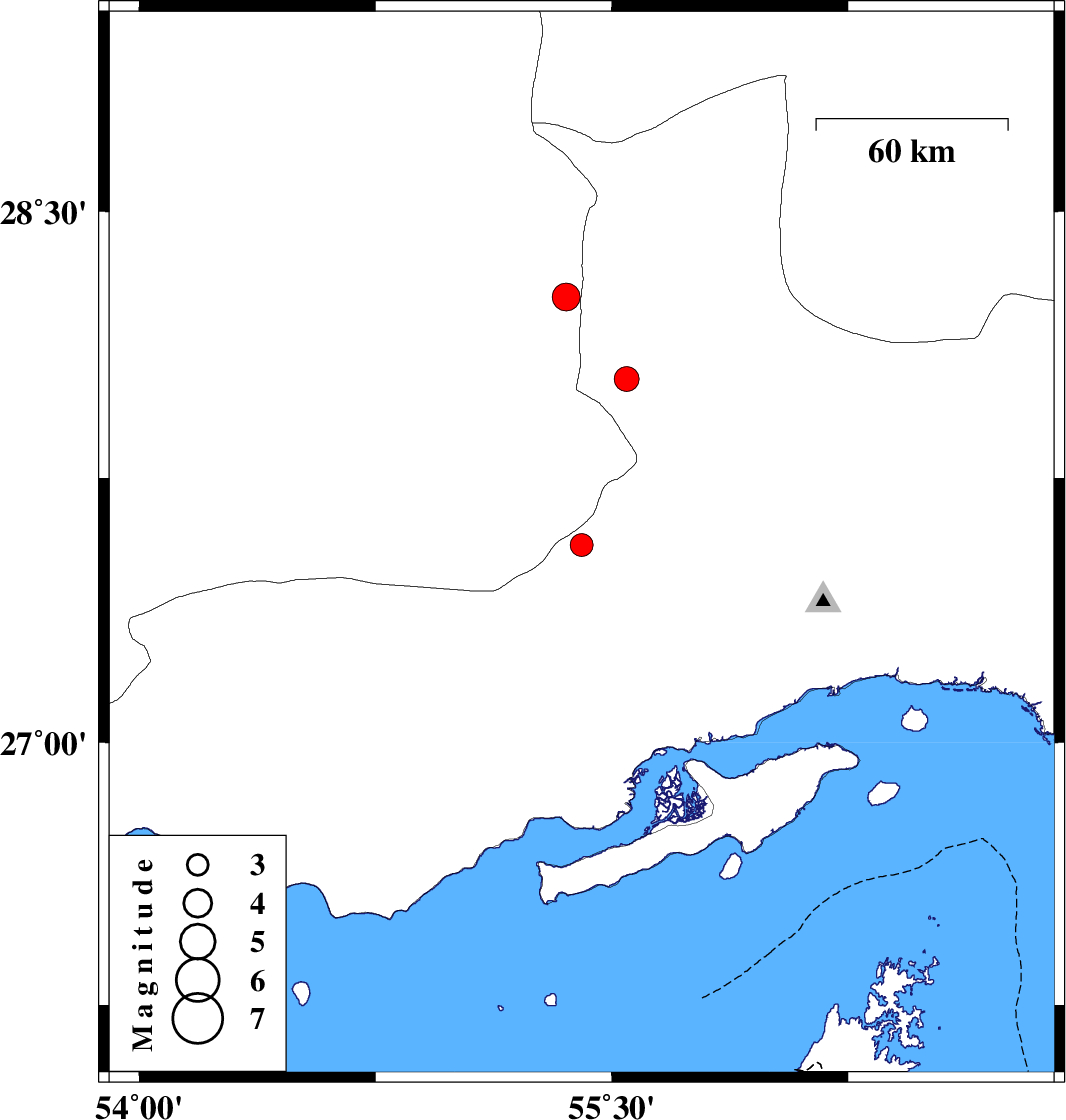 | 2024/12/29 | 12:07:44.6 | 15:37:44.6 | 27.56 | 55.404 | 12 | ML3.2 | Hormozgan Province, 106 km South-East of Lar | ||