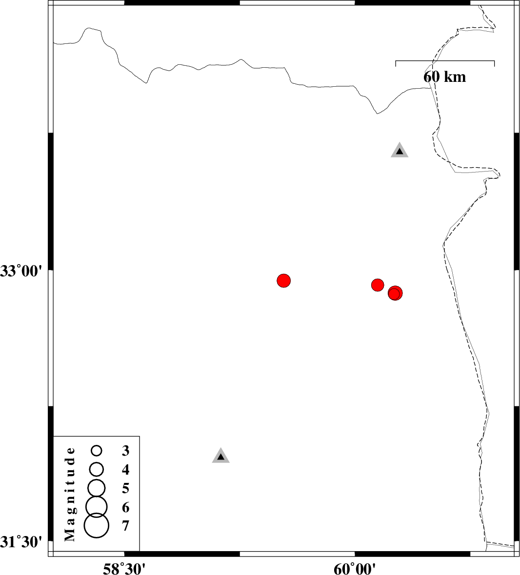 | 2024/12/11 | 05:22:25.2 | 08:52:25.2 | 32.917 | 60.148 | 8 | ML3.7 | Khorasan(south) Province, 47 km North-East of Sarbisheh |