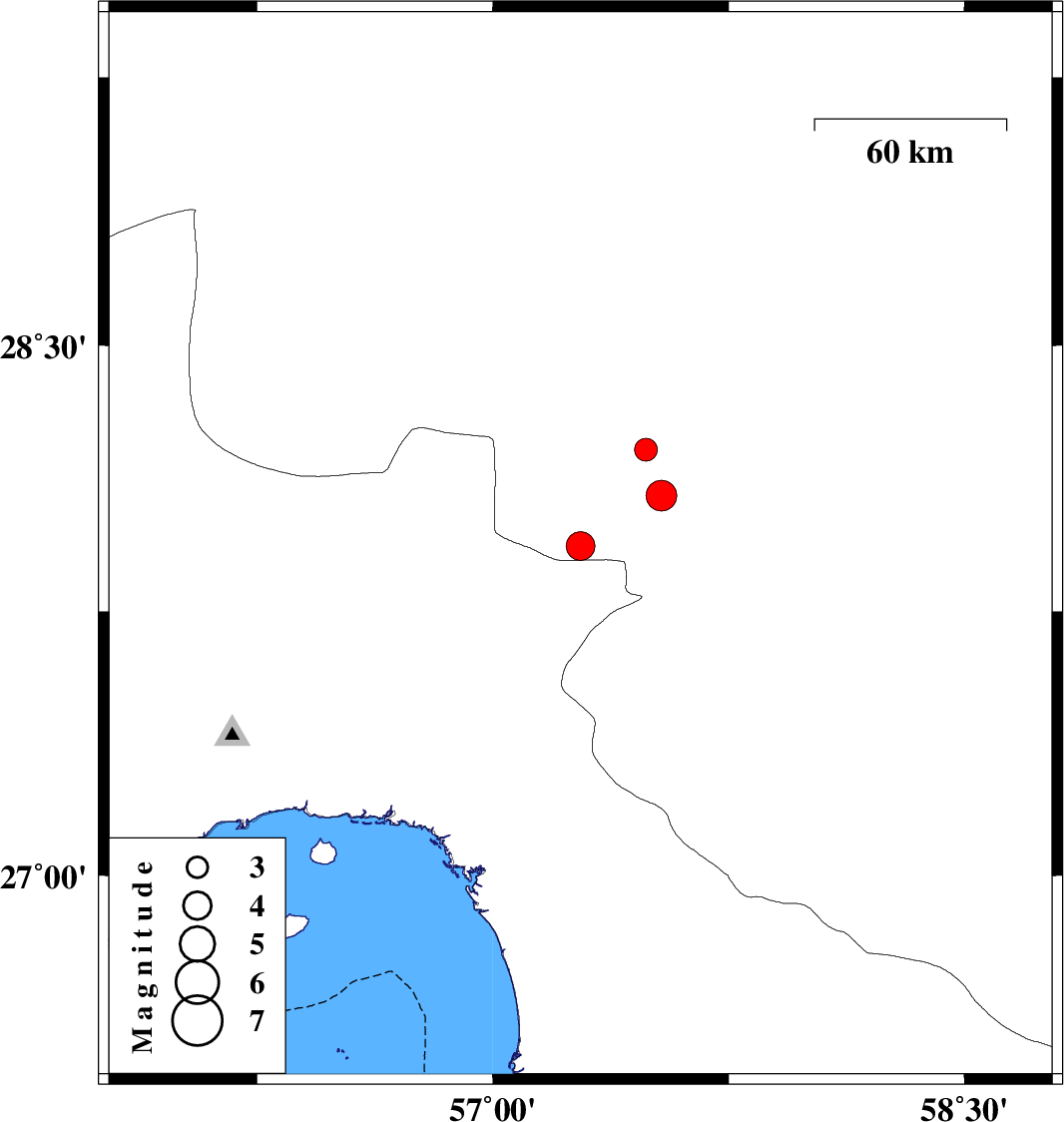 | 2025/01/06 | 03:54:16.8 | 07:24:16.8 | 28.077 | 57.537 | 10 | ML4.4 | Kerman Province, 21 km North-West of Kahnuj |