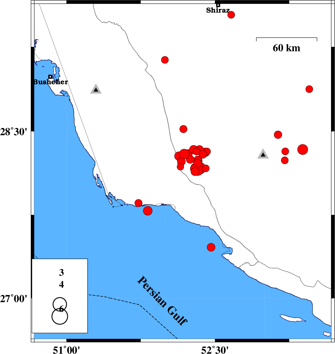 2025/01/07 13:08:29.8 16:38:29.8 28.17852.18512 ML3.6 Fars Province, 41 km North-East of Bandar-e kangan