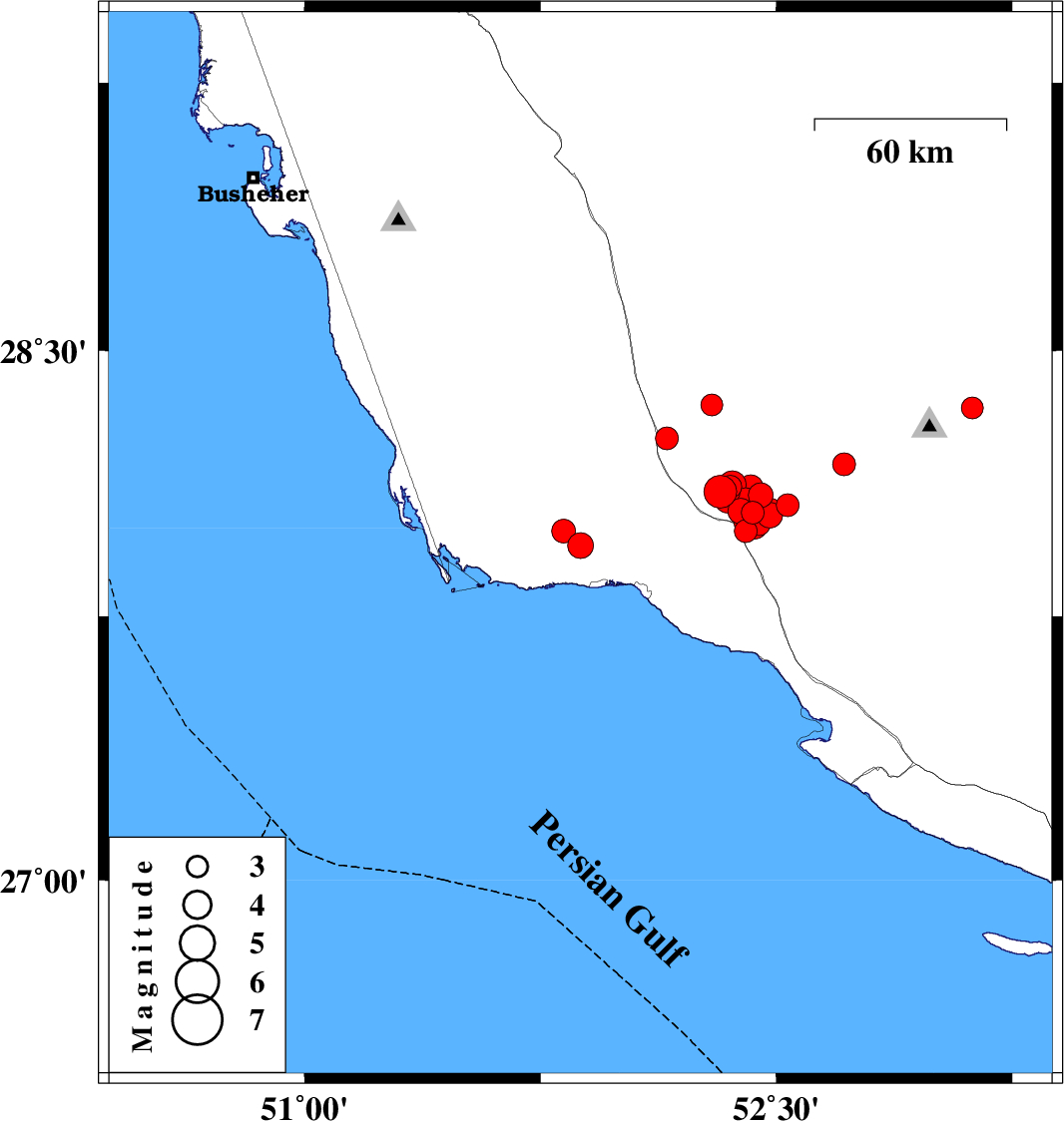 2025/01/30 12:51:05.7 16:21:05.7 28.0852.37912 ML4.4 Fars Province, 28 km North of Jam
