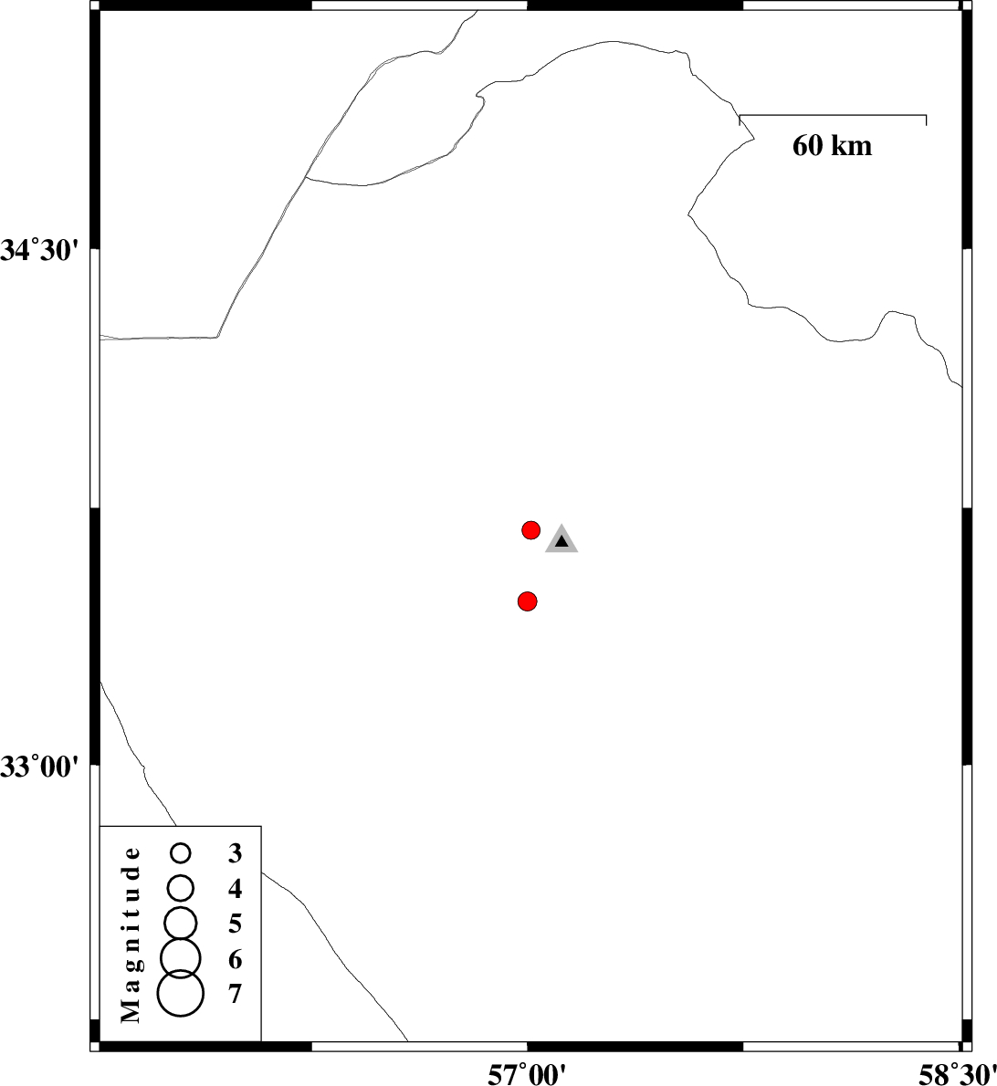| 2025/02/21 | 09:09:11.3 | 12:39:11.3 | 33.477 | 56.999 | 10 | ML2.9 | Yazd Province, 15 km South of Tabas |