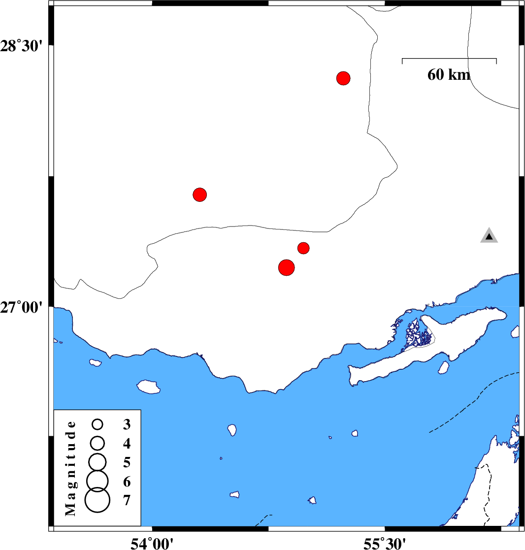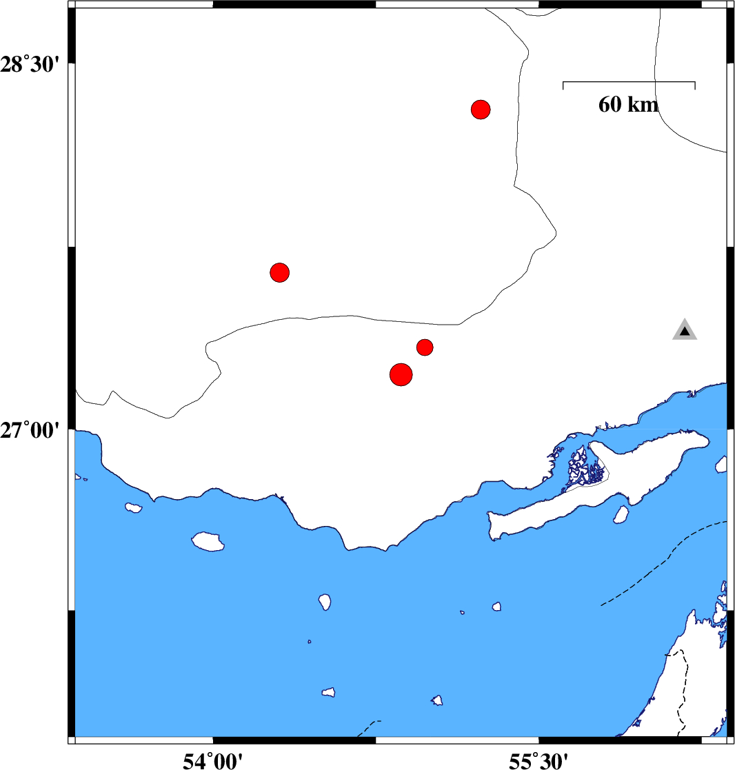 | 2025/03/01 | 20:16:46.0 | 23:46:46.0 | 27.645 | 54.306 | 12 | ML3.9 | Fars Province, 5 km of Lar | ||
