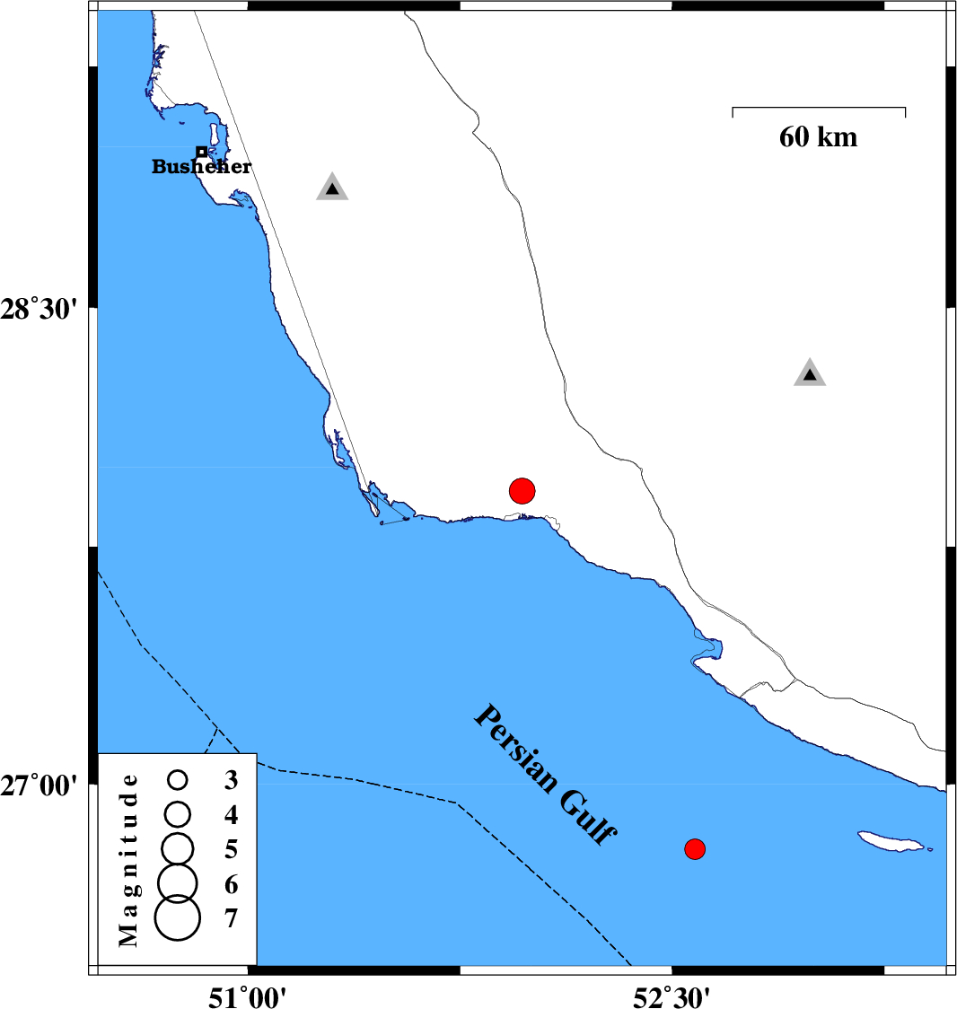 | 2025/03/20 | 22:43:46.5 | 02:13:46.5 | 27.924 | 51.969 | 12 | ML4.1 | Bushehr Province, 14 km of Bandar-e kangan |
