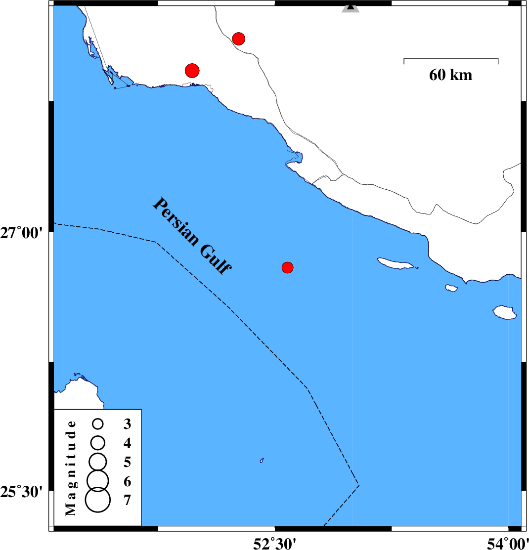 | 2025/03/20 | 22:43:46.5 | 02:13:46.5 | 27.924 | 51.969 | 12 | ML4.1 | Bushehr Province, 14 km of Bandar-e kangan | ||