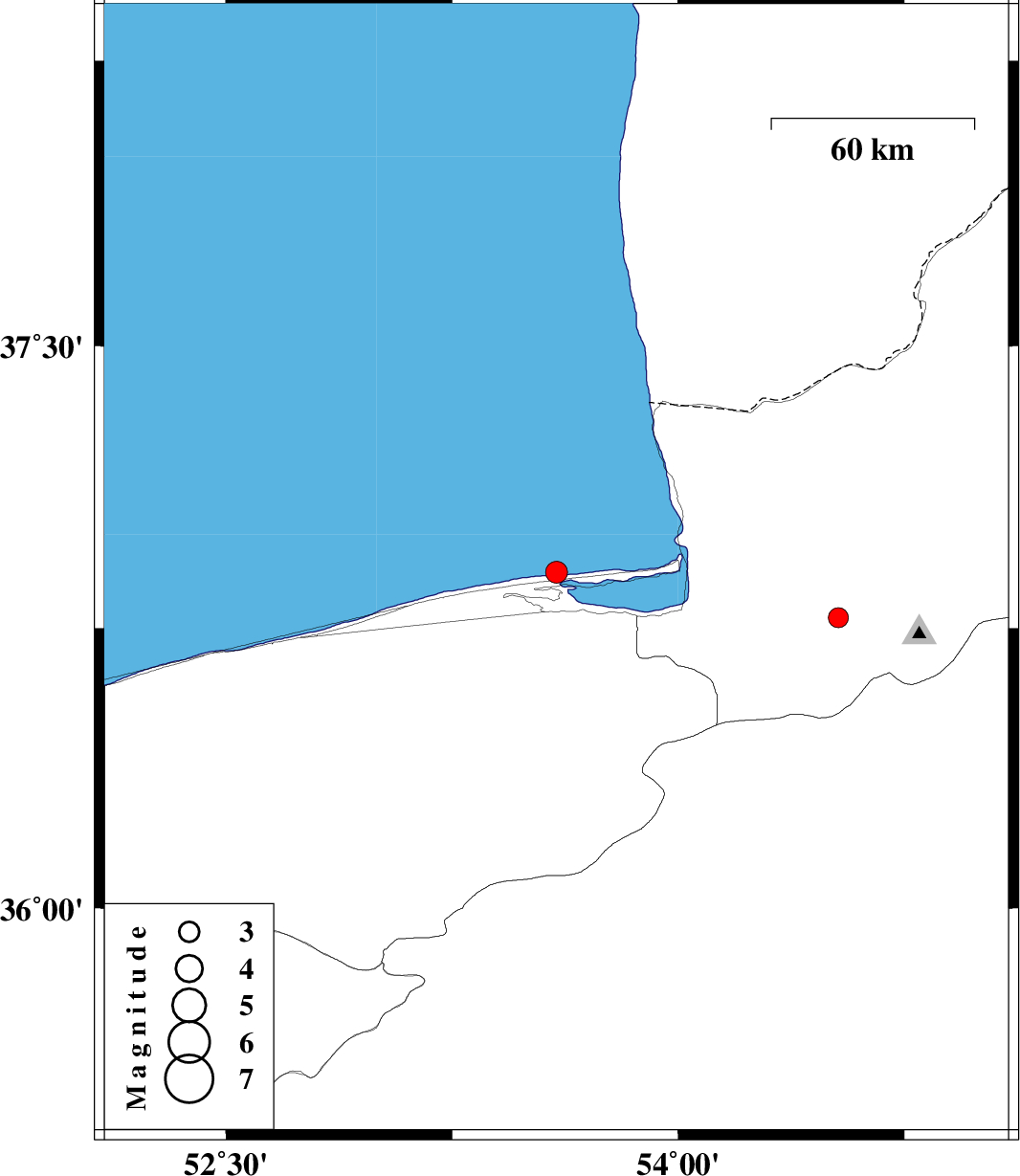 | 2025/06/20 | 11:58:41.1 | 15:28:41.1 | 36.9 | 53.596 | 12 | ML3.2 | Caspian Sea, 23 km North of Behshahr | ||