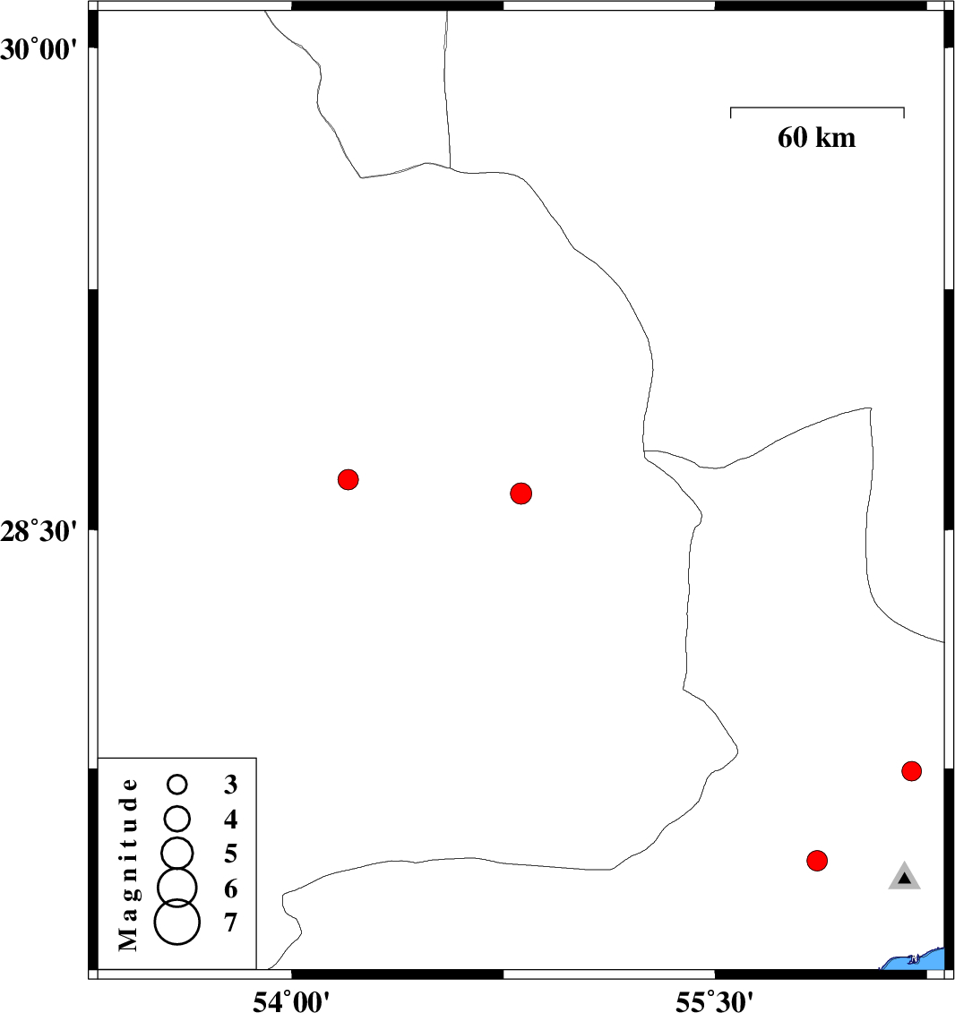 | 2025/06/09 | 13:08:11.2 | 16:38:11.2 | 28.657 | 54.2 | 12 | ML3.2 | Fars Province, 34 km -West of Darab | ||