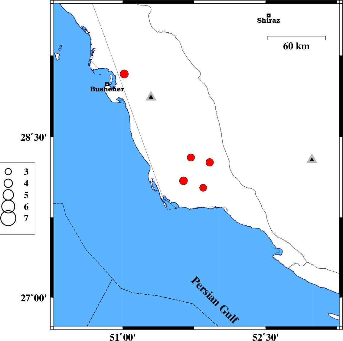 | 2025/08/05 | 02:25:43.6 | 05:55:43.6 | 28.228 | 51.775 | 12 | ML3.9 | Bushehr Province, 53 km North-West of Bandar-e kangan | ||