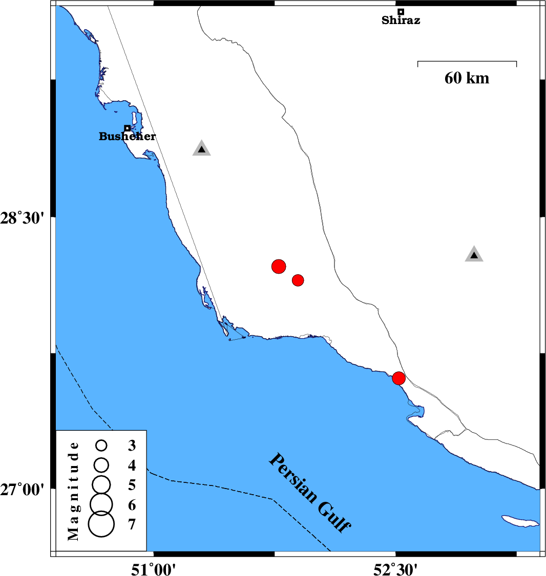 | 2025/08/09 | 20:14:30.8 | 23:44:30.8 | 28.151 | 51.894 | 12 | ML3.3 | Bushehr Province, 40 km North-West of Bandar-e kangan | ||