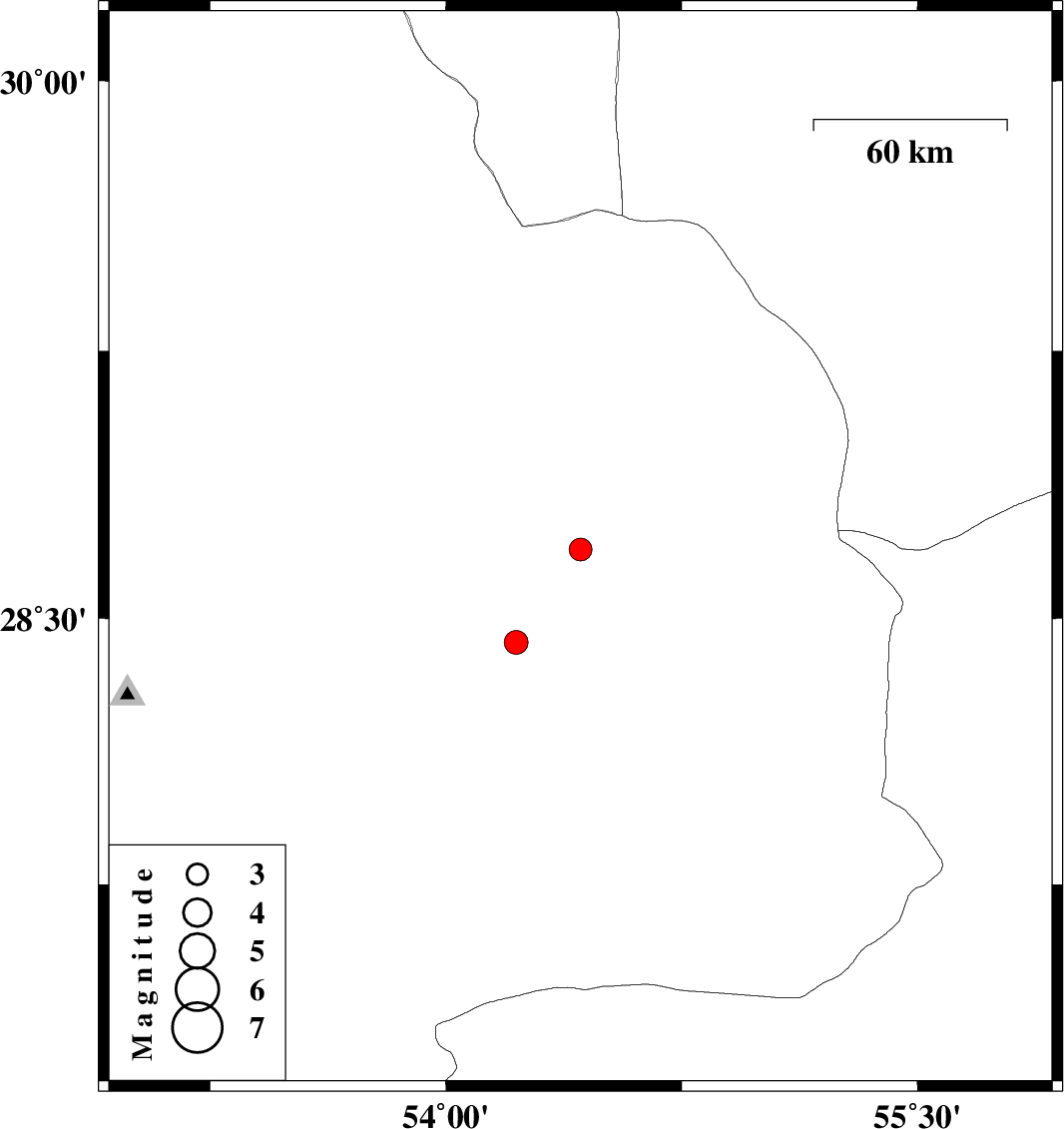 | 2025/07/27 | 00:52:49.8 | 04:22:49.8 | 27.3 | 53.054 | 12 | ML3.3 | Fars Province, 12 km -West of Lamerd | ||