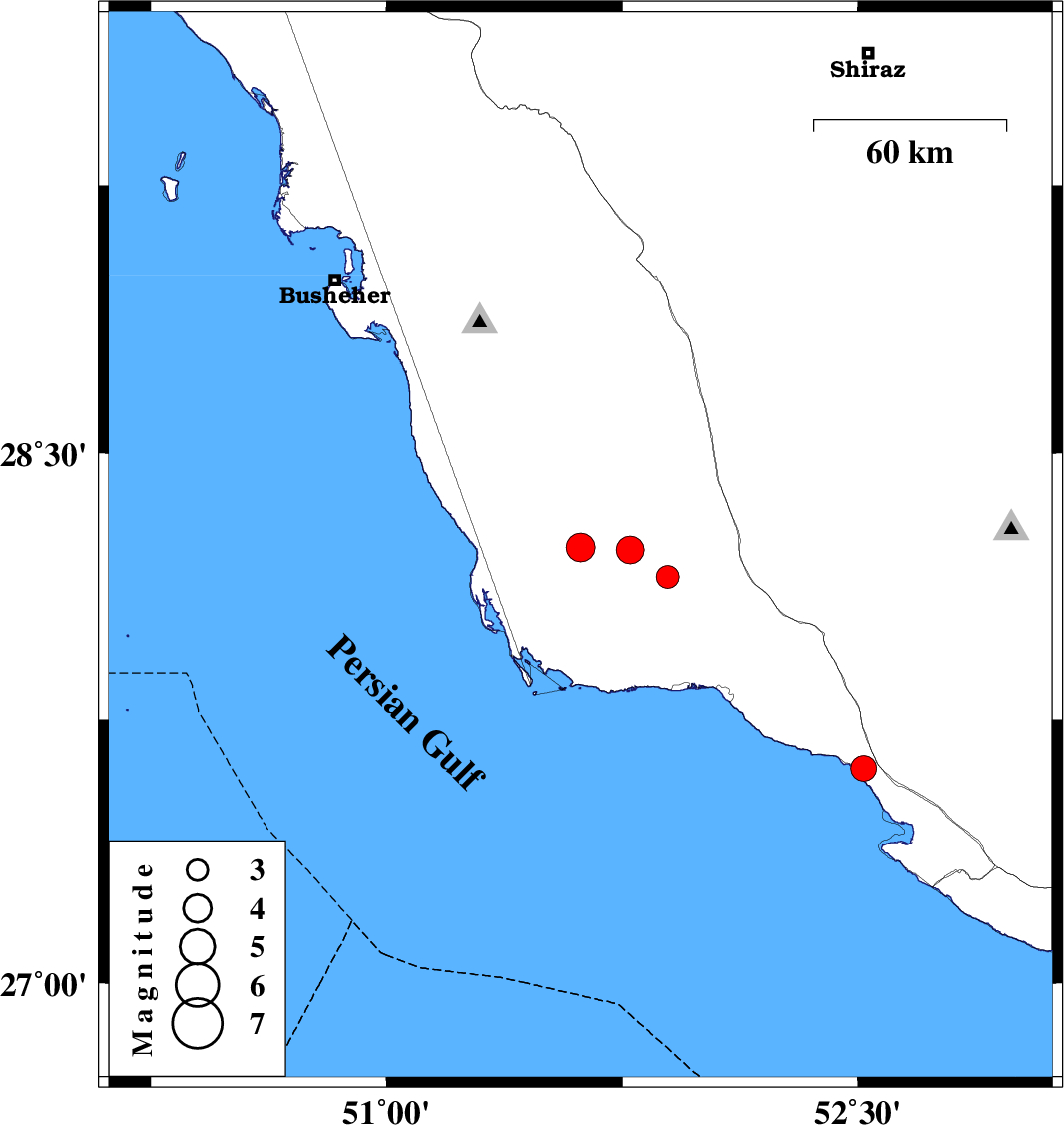 | 2025/08/12 | 10:43:48.8 | 14:13:48.8 | 28.234 | 51.617 | 16 | ML4.1 | Bushehr Province, 52 km South-East of Khormog | ||