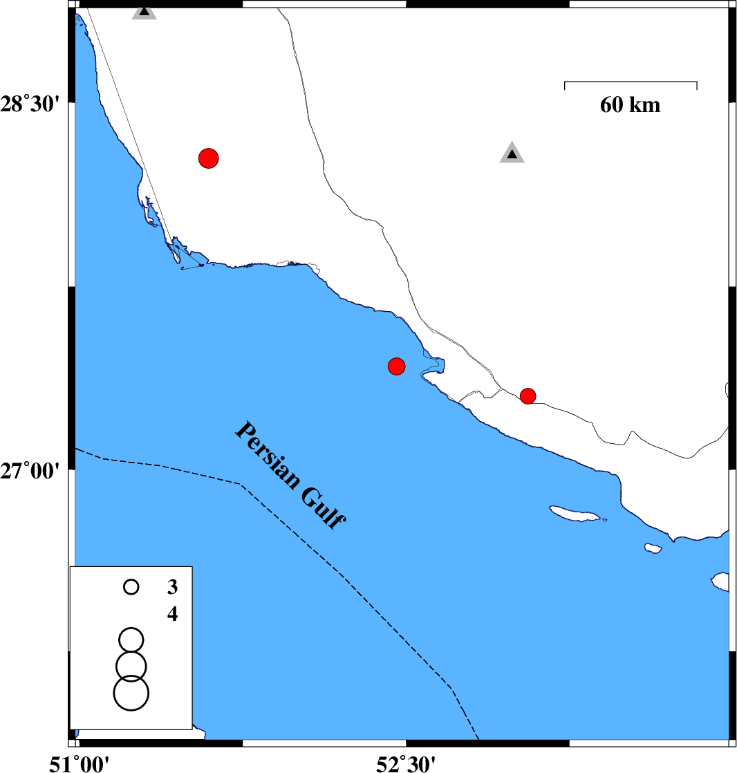 | 2025/08/12 | 10:43:48.8 | 14:13:48.8 | 28.234 | 51.617 | 16 | ML4.1 | Bushehr Province, 52 km South-East of Khormog |