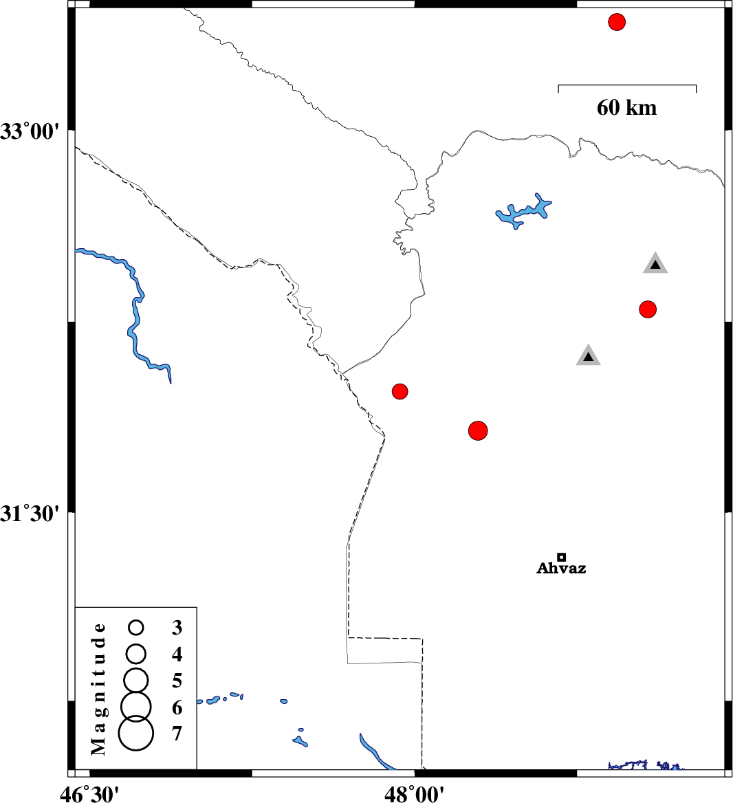 | 2025/08/20 | 23:03:43.6 | 02:33:43.6 | 31.821 | 48.293 | 12 | ML4 | Khoozestan Province, 31 km North-East of Susangerd |