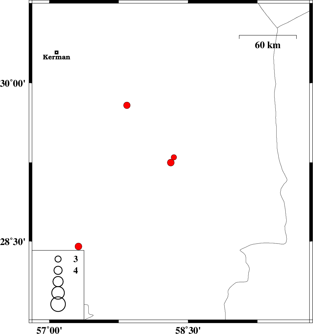 2025/09/23 | 09:20:24.2 | 12:50:24.2 | 29.248 | 58.313 | 10 | ML3.4 | Kerman Province, 16 km North of Bam | ||