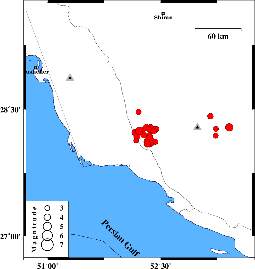 2025/01/07 13:08:29.8 16:38:29.8 28.17852.18512 ML3.6 Fars Province, 41 km North-East of Bandar-e kangan
