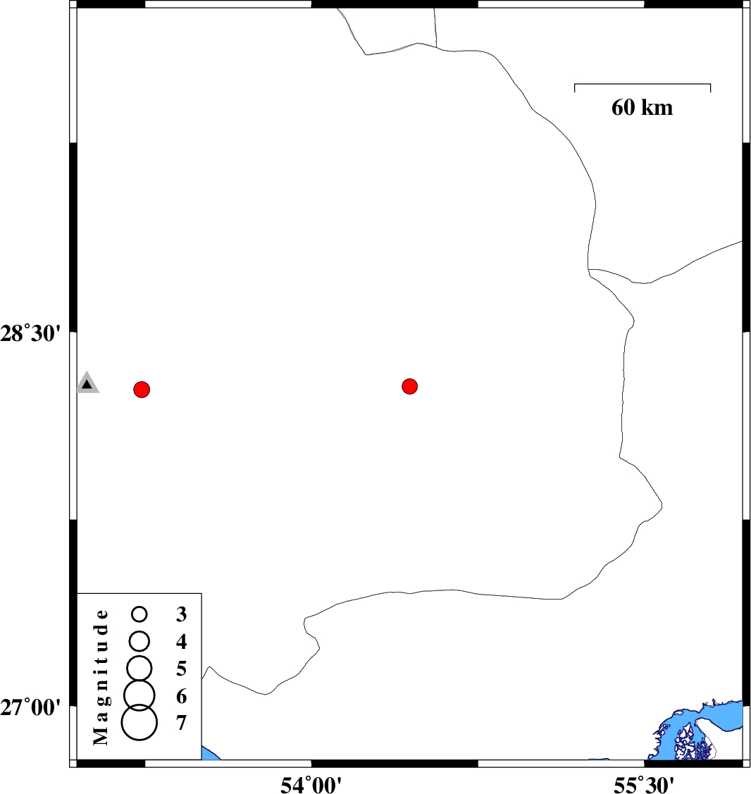 | 2025/01/14 | 03:47:49.5 | 07:17:49.5 | 28.282 | 54.442 | 12 | ML3.1 | Fars Province, 53 km South of Darab | ||