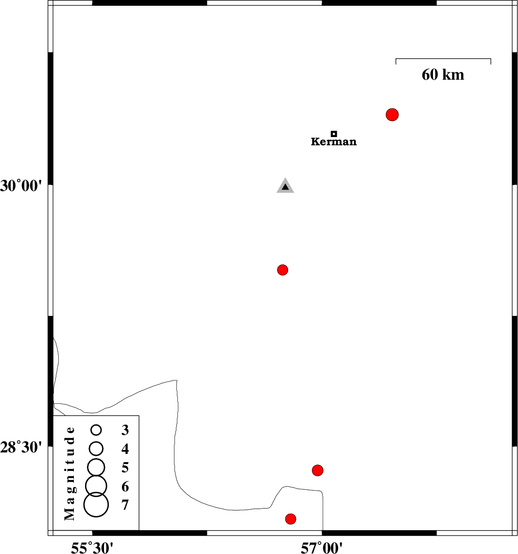 | 2025/10/26 | 19:23:56.9 | 22:53:56.9 | 30.397 | 57.459 | 9 | ML3.6 | Kerman Province, 38 km North-East of Kerman |
