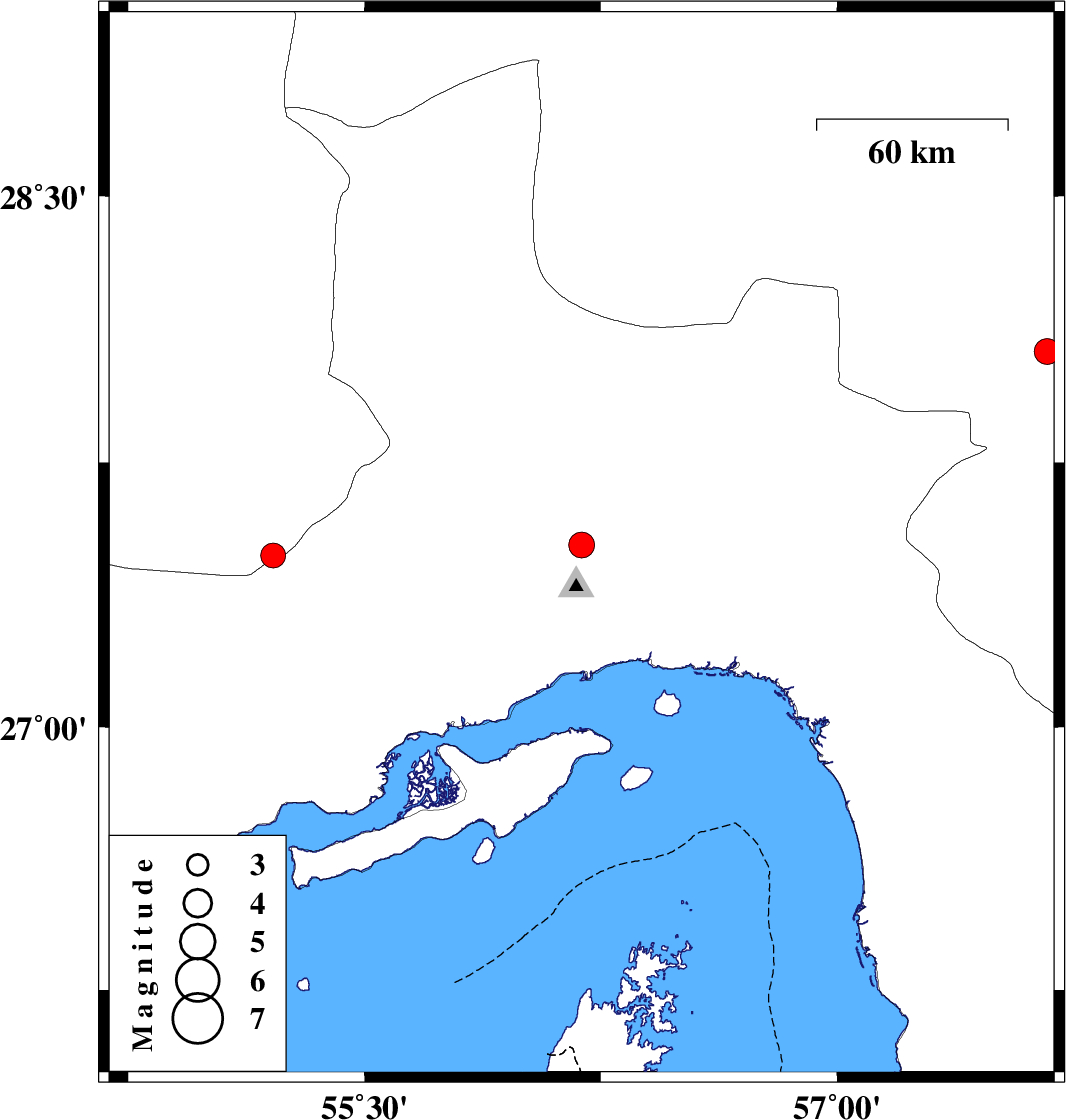 | 2025/12/07 | 09:48:43.6 | 13:18:43.6 | 28.063 | 57.667 | 12 | ML3.7 | Kerman Province, 13 km North of Kahnuj |